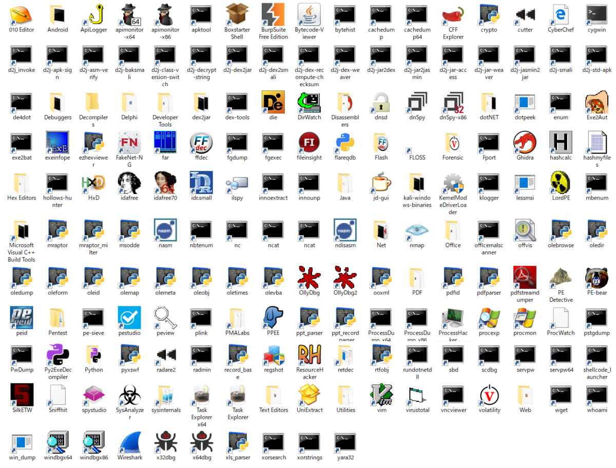 010 Editor ApiLogger Boxstarter Shell BurpSuite Free Edition Bytecode-Viewer CFF Explorer CyberChef DirWatch Exe2Aut FLOSS FakeNet-NG Fport Ghidra HxD KernelModeDriverLoader LordPE Microsoft Visual C++ Build Tools OllyDbg OllyDbg2 PE Detective PE-bear PMALabs PPEE ProcWatch ProcessDump_x64 ProcessDump_x86 ProcessHacker PwDump Py2ExeDecompiler ResourceHacker SilkETW Sniffhit SysAnalyzer Task Explorer Task Explorer x64 UniExtract Wireshark apimonitor-x64 apimonitor-x86 apktool bytehist cachedump cachedump64 crypto cutter cygwin d2j-apk-sign d2j-asm-verify d2j-baksmali d2j-class-version-switch d2j-decrypt-string d2j-dex-recompute-checksum d2j-dex-weaver d2j-dex2jar d2j-dex2smali d2j-jar-access d2j-jar-weaver d2j-jar2dex d2j-jar2jasmin d2j-jasmin2jar d2j-smali d2j-std-apk d2j_invoke de4dot dex-tools die dnSpy dnSpy-x86 dnsd dotpeek enum exe2bat exeinfope ezhexviewer far ffdec fgdump fgexec fileinsight flareqdb hashcalc hashmyfiles hollows-hunter idafree idafree70 idr.small ilspy innoextract innounp jd-gui klogger lessmsi mbenum mraptor mraptor_milter msodde nasm nbtenum nc ncat ndisasm nmap officemalscanner offvis olebrowse oledir oledump oleform oleid olemap olemeta oleobj oletimes olevba ooxml pdfid pdfparser pdfstreamdumper pe-sieve peid pestudio peview plink ppt_parser ppt_record_parser procexp procmon pstgdump pyxswf radare2 radmin record_base regshot retdec rtfobj rundotnetdll sbd scdbg servpw servpw64 shellcode_launcher spystudio sysinternals vim virustotal vncviewer volatility wget whoami win_dump windbgx64 windbgx86 x32dbg x64dbg xls_parser xorsearch xorstrings yara32